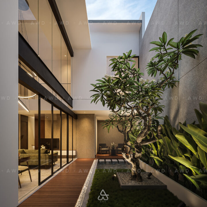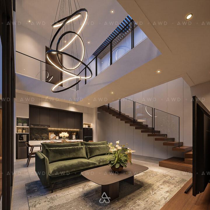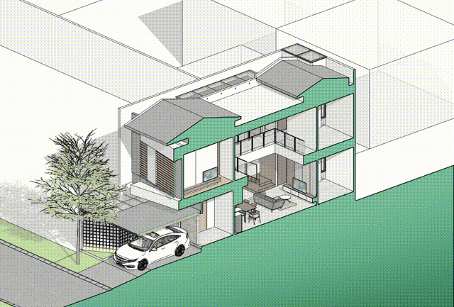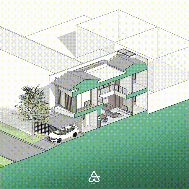 Hunian merupakan kebutuhan primer bagi seluruh kalangan tidak terkecuali bagi client kami yaitu project KP House yang berlokasi di Malang, Jawa Timur. Rumah ini merupakan lahan kosong dengan luas bangunan 185 m2 yang akan dihuni oleh pasangan baru. Pada lantai 1 terdapat carport dengan kapasitas 2 mobil, lalu masuk ke dalam rumah disambut oleh taman samping yang membuat psikologis penghuni menjadi fresh setelah seharian beraktivitas. Masuk ke area utama berupa ruang keluarga dan ruang makan dengan konsep open plan yang menghadap langsung ke taman. Terdapat pula ruang tidur tamu dan kamar mandi tamu untuk mengakomodir tamu atau keluarga yang menginap di rumah ini. Selain itu juga terdapat area service berupa dapur kotor, area ART berupa kamar tidur, kamar mandi, dan area cuci jemur. Pada lantai 2 terdapat area yang lebih privat berupa kamar tidur utama dan 2 kamar tidur. Façade bangunan ini terdapat kisi-kisi miring untuk mereduksi panas matahari dan juga untuk merespon akses utama sehingga bangunan terkesan menghadap ke arah penghuni yang akan menuju ke dalam bangunan.